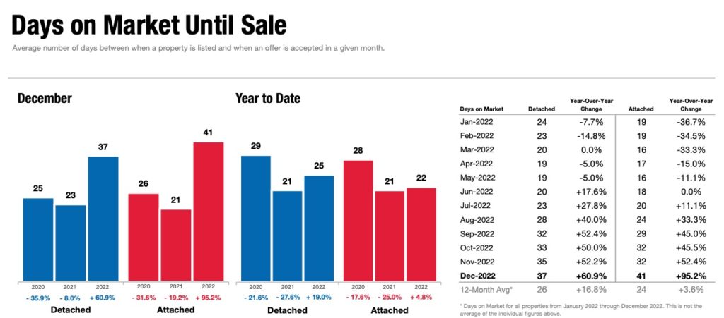 Days on the market until sale for December 2022 continue to rise. It was 37 days on the market for single-family detached homes, up from 23 days in December 2021, and 25 Days in December 2020. For condos and duplexes, it was 41 days in December 2022 vs. 21 days in December 2021, and 26 days in December 2020.