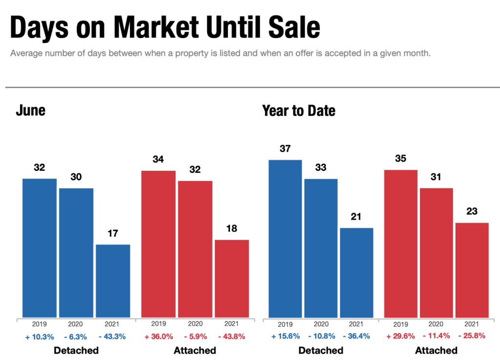Days on the market until sale for June 2021 continued at record low levels. It was 17 days on the market for single-family detached homes, down from 30 day in 2020. For condos and duplexes it was 18 days in June vs. 32 days in June 2020.